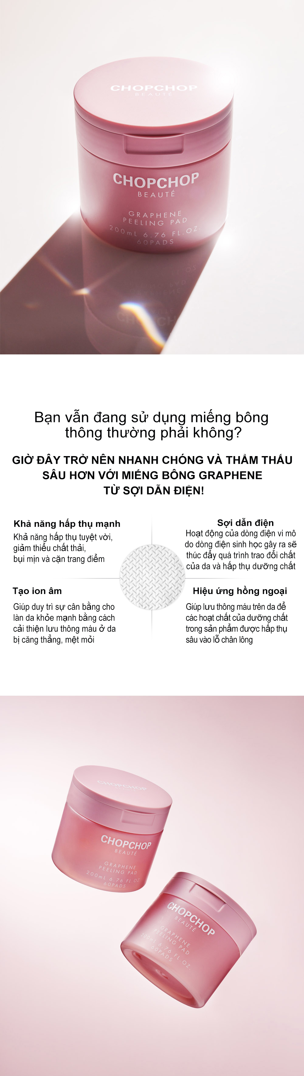 Miếng toner 2 mặt không chứa cồn, ứng dụng công nghệ màng Graphene nhẹ nhàng tẩy tế bào chết và bụi bẩn trên da để mang lại làn da sáng hơn, bóng bẩy mà không làm mất đi độ ẩm trên da của bạn.